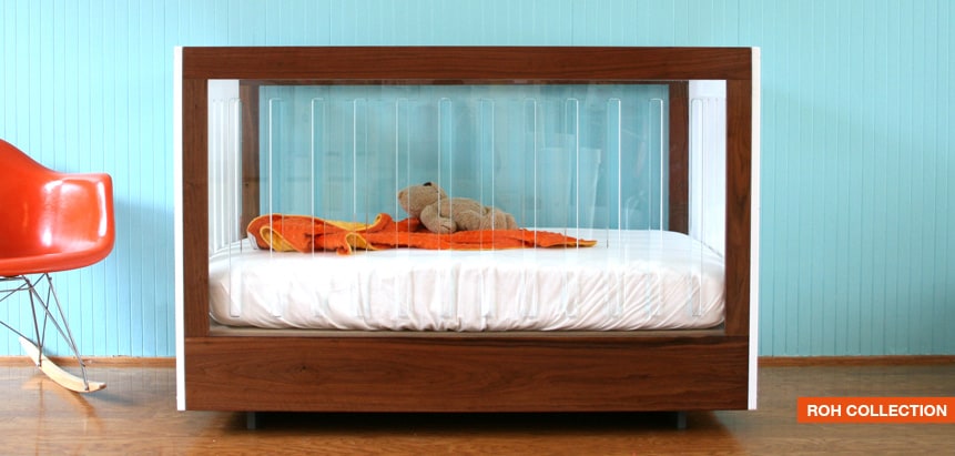 The most expensive crib in the collection is the high-end acrylic and wood Roh crib, which comes in four versions ($1700 to $2700). The version with the walnut frame and two sides of acrylic slats is the most expensive option (pictured).