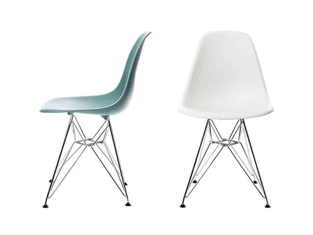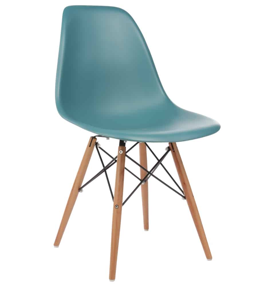 What makes this high chair, the Tuo ($128), an Eames-style chair? Those wooden doweling legs splaying out from under than egg-shaped seat. The original Eames DSW was made of colored fiberglass and had a pre-curser design (the DSR) that used wire rods for the legs. Both designs became popular throughout American in schools and other institutional settings as well as in homes.