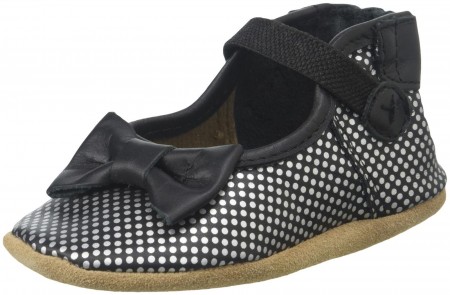 First, look for shoes that have the most flexible soles. You’ll also want fabrics that breath and stretch, like canvas and leather— stay away from vinyl shoes. The best brands we found were recommended by readers. Robeez (a division of Stride Rite, pictured) are made of leather, have soft, skid-resistant soles and are machine washable. They start at $24 for a basic pair.