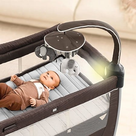 The Chicco Lullaby Dream Play Yard includes an electronic mobile and nightlight among other features. Babies really don’t need all this and it will save you bucks if you avoid all these extras.